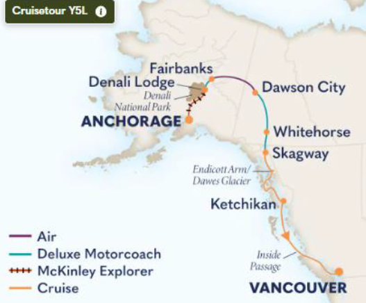Then we’ll board the train through the mountains and head to Skagway for our 4 day cruise before disembarking in Vancouver.